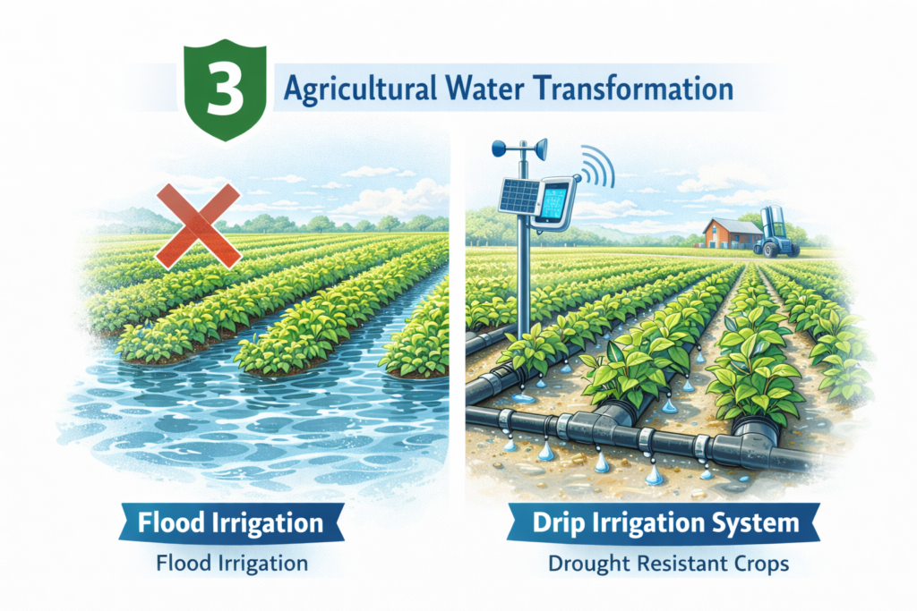 3. Transformasi Pertanian Sektor pertanian menyerap sekitar 70% air tawar dunia. Tanpa transformasi radikal — termasuk pergeseran jenis tanaman, peningkatan efisiensi irigasi, dan penghapusan subsidi yang mendorong penggunaan air berlebihan — krisis pangan global akan memburuk secara drastis.